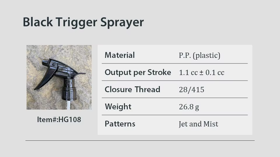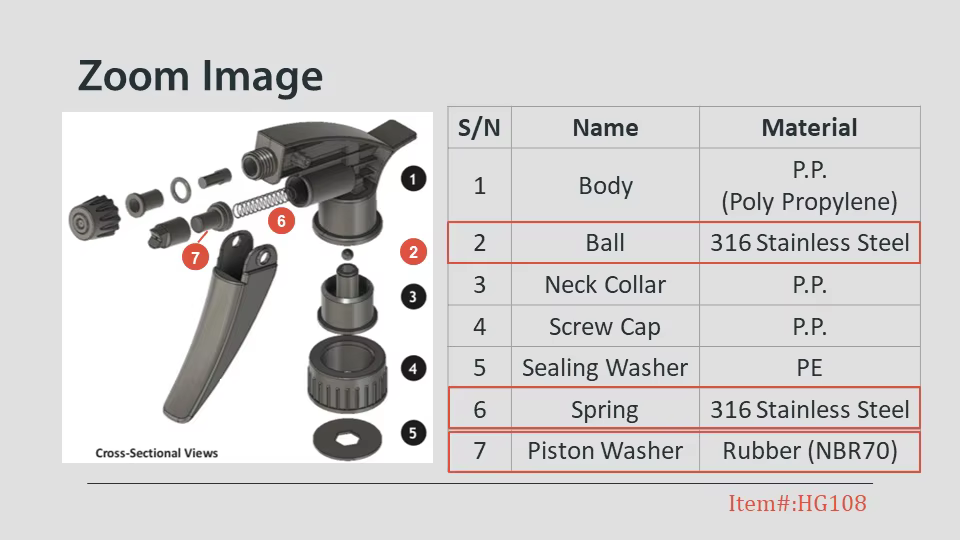 • يعمل بخاخ الزناد المقاوم للمواد الكيميائية بكفاءة عالية مع معظم المواد الكيميائية القوية التي قد تُلحق الضرر عادةً ببخاخات الزناد العادية.